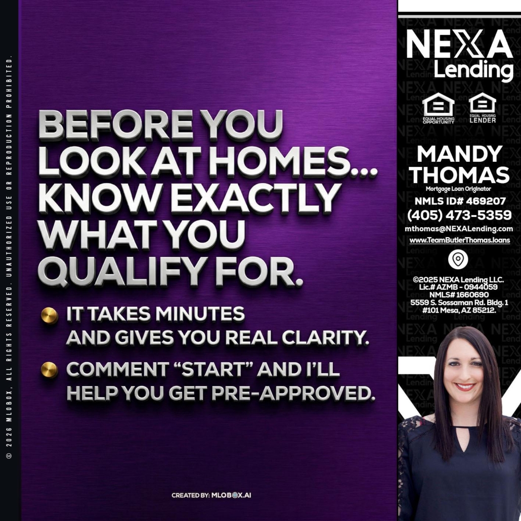 BEFORE YOU - Mandy Thomas -Branch ManagerHi, my name is Mandy Thomas. I’m a Loan Officer with NEXA Lending LLC., offering personalized mortgage solutions, fast customized quotes, great rates and service with integrity.