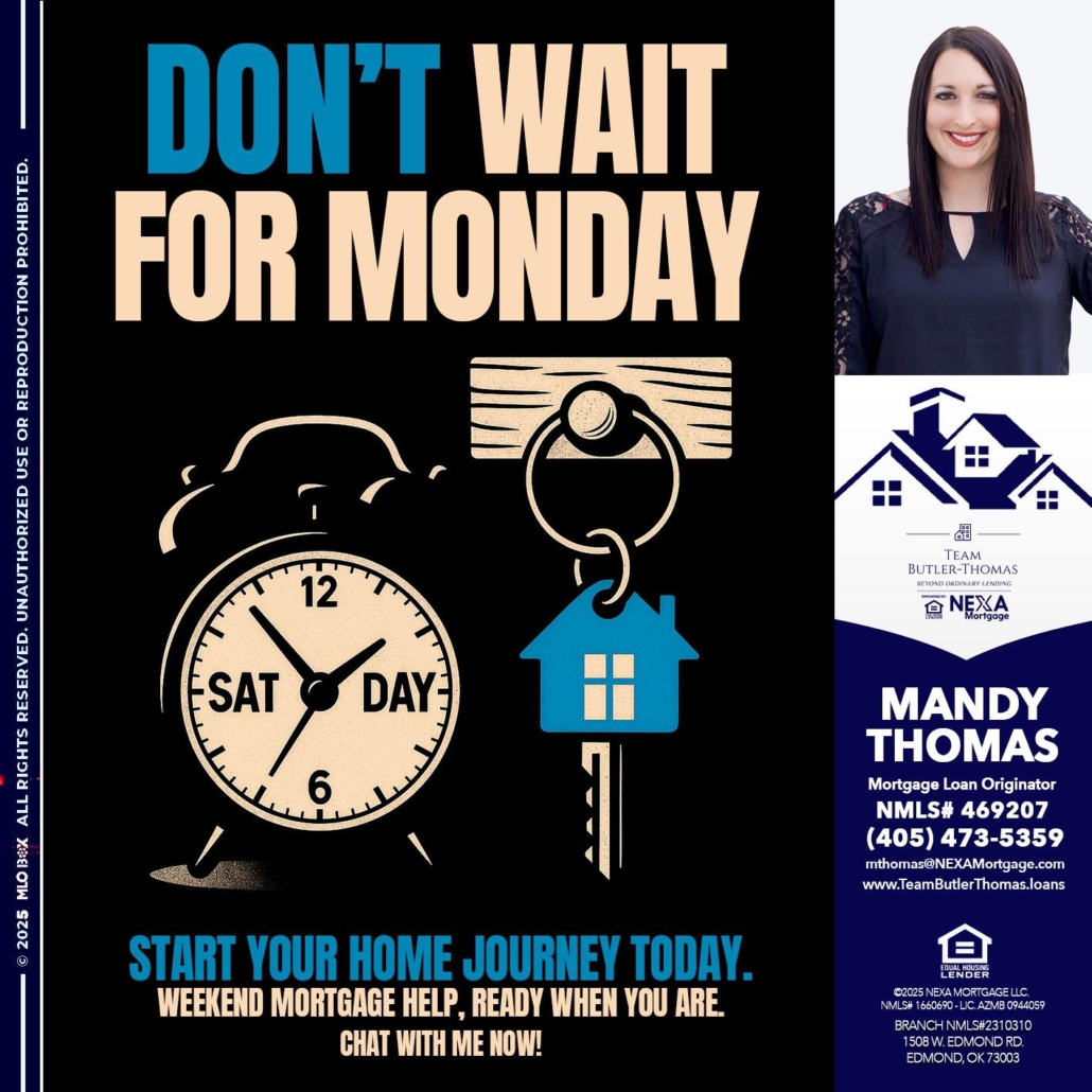 DONT WAIT FOR MONDAY - Mandy Thomas -Branch ManagerHi, my name is Mandy Thomas. I’m a Loan Officer with NEXA Mortgage LLC., offering personalized mortgage solutions, fast customized quotes, great rates and service with integrity.
