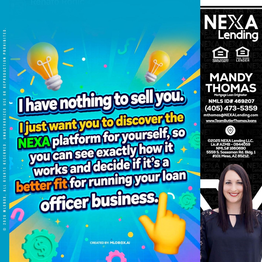 I HAVE NOTHING - Mandy Thomas -Branch ManagerHi, my name is Mandy Thomas. I’m a Loan Officer with NEXA Lending LLC., offering personalized mortgage solutions, fast customized quotes, great rates and service with integrity.
