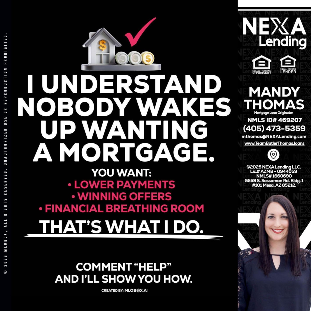 I UNDERSTAND - Mandy Thomas -Branch ManagerHi, my name is Mandy Thomas. I’m a Loan Officer with NEXA Lending LLC., offering personalized mortgage solutions, fast customized quotes, great rates and service with integrity.