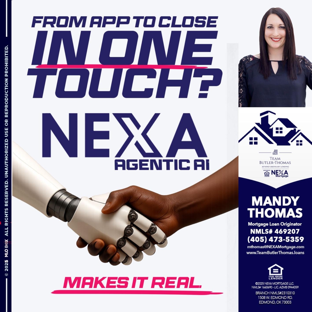 IN ONE TOUCH - Mandy Thomas -Branch ManagerHi, my name is Mandy Thomas. I’m a Loan Officer with NEXA Mortgage LLC., offering personalized mortgage solutions, fast customized quotes, great rates and service with integrity.