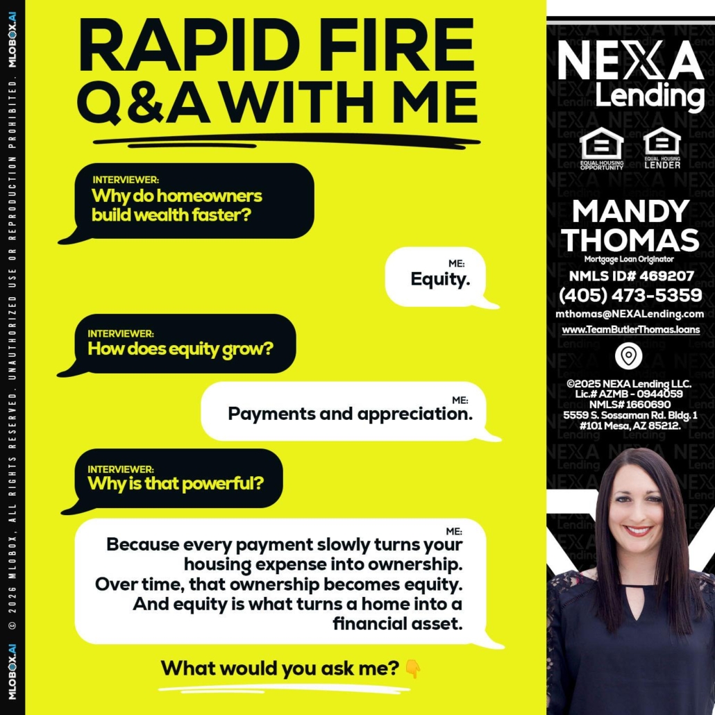 RAPID FIRE Q&A - Mandy Thomas -Branch ManagerHi, my name is Mandy Thomas. I’m a Loan Officer with NEXA Lending LLC., offering personalized mortgage solutions, fast customized quotes, great rates and service with integrity.