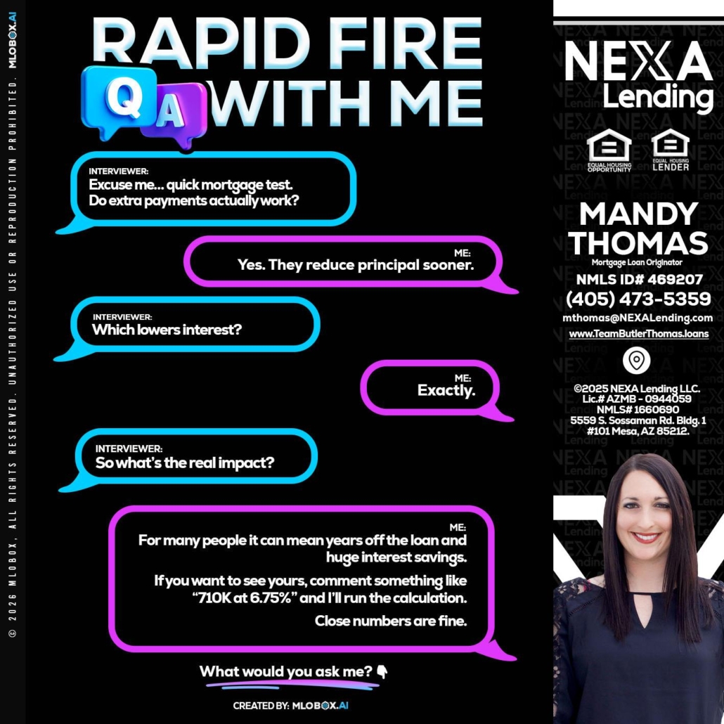 Hi, my name is Mandy Thomas. I’m a Loan Officer with NEXA Lending LLC., offering personalized mortgage solutions, fast customized quotes, great rates and service with integrity.