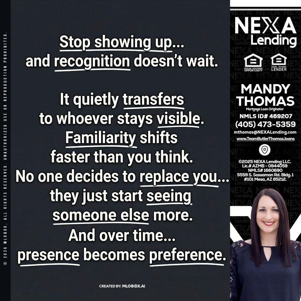 STOP SHOWING - Mandy Thomas -Branch ManagerHi, my name is Mandy Thomas. I’m a Loan Officer with NEXA Lending LLC., offering personalized mortgage solutions, fast customized quotes, great rates and service with integrity.